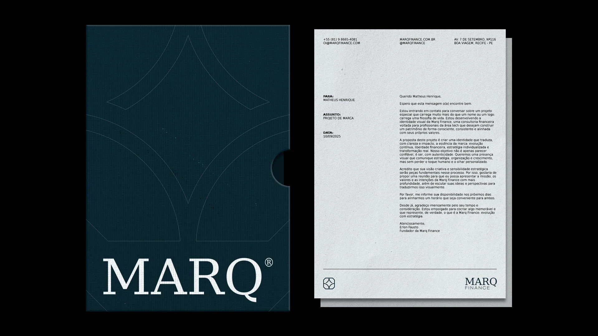 A identidade visual foi totalmente reformulada, assumindo um visual mais maduro, elegante e técnico. Foram desenvolvidas diversas variações e aplicações da marca, permitindo uma maior versatilidade e continuidade em todos os ecossistemas onde a MARQ Finance® irá atuar.